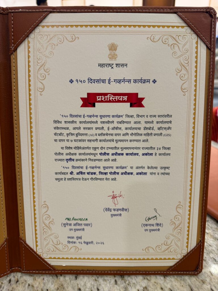 अकोला (प्रतिनिधी) – अकोला पोलिस अधीक्षक कार्यालयाने डिजिटल सेवांच्या प्रभावी अंमलबजावणीत उत्कृष्ट कामगिरी करत राज्यात मानाचा तिसरा क्रमांक पटकावला आहे. महाराष्ट्र शासनाच्या 150 दिवसांच्या ई-गव्हर्नन्स विशेष मोहिमेत ही उल्लेखनीय कामगिरी करण्यात आली.